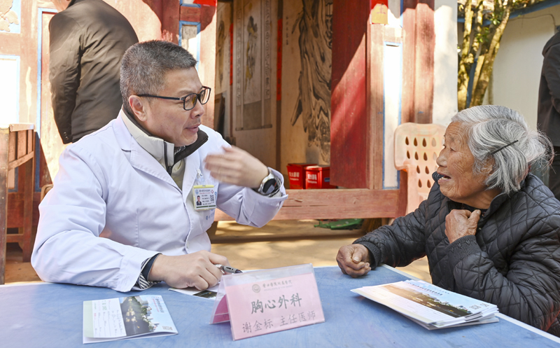 活动现场,来自胸心外科、全科、骨科、神经内科、耳鼻喉科、消化内科等科室的专家们耐心细致地为村民问诊查体、分析病情,免费提供血压血糖测量、用药指导和健康咨询。针对老年人多发的心脏、骨骼等疾病,专家们专门配置便携设备进行心电图检测及B超检查,并结合村民既往病史提出个性化诊疗建议,当场开具处方、发放药品,实现诊疗开药一站式服务,让行动不便的老人在家门口就能享受到专业诊疗服务。