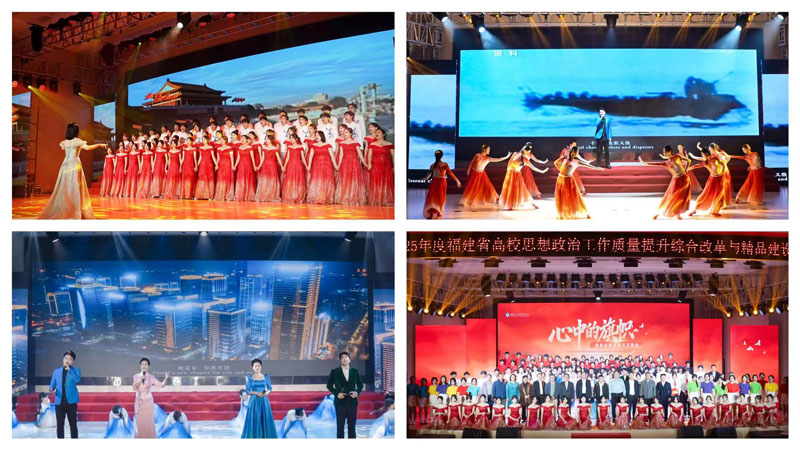 作为2025年度福建省高校思想政治工作质量提升综合改革与精品建设项目,晚会以“烽火燃梦——觉醒与转折”“山河颂歌——共筑家园情”“时代抉择——奋进与担当”“逐梦前行——使命续新章”四个篇章,13个歌舞节目为载体,串联起从抗战时期的觉醒求索、新中国成立的改天换地、改革开放的开拓奋进,到新时代新征程的逐梦扬帆的发展历程,生动再现革命先烈和各行各业英雄的感人事迹,深刻彰显了中国共产党百年征程的初心使命。