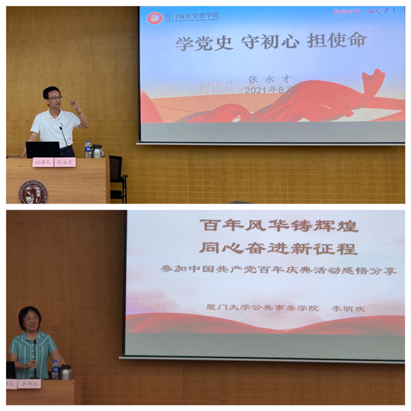 读书班期间,学员们认真学习了习近平总书记“七一”重要讲话、习近平总书记在党史学习教育动员大会上的讲话,以及中共厦门市委书记赵龙在全市党史学习教育动员大会上的讲话精神等。学员们还认真聆听了厦门市纪委监委办公厅原主任、厦门城市党建学院客座教授张永才作的《学党史 守初心 担使命》党史学习教育专题讲座,张主任声情并茂的报告感染了在场的每一个社员;厦门大学公共事务学院教授李明欢以参加庆祝中国共产党成立一百周年大会的亲身经历,从不同视角讲述了庆祝大会的隆重热烈、精密组织、科学安排,以及所体现的中国共产党强大的动员力、组织力、号召力和凝聚力。
