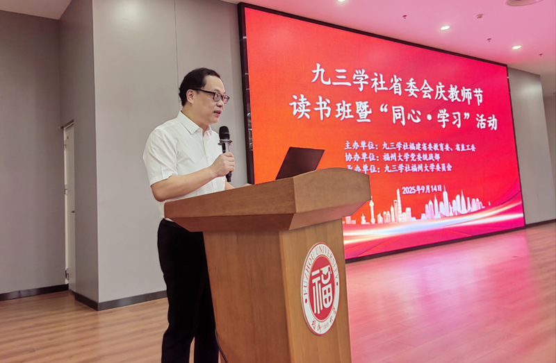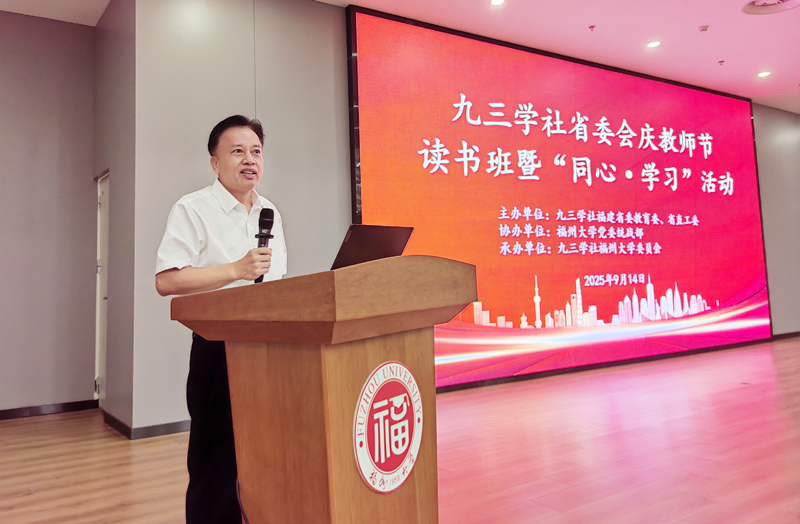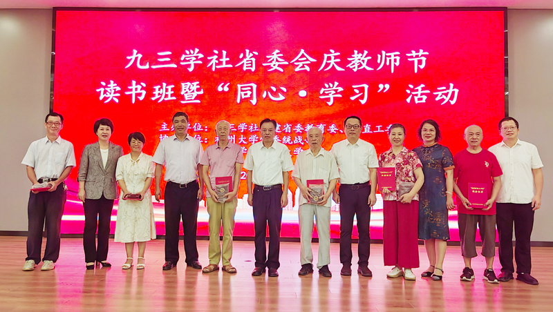 9月14日上午,九三学社福建省委教育专委会、社省直工委联合在福州大学举办庆祝第41个教师节读书班暨“同心·学习”活动。九三学社福建省委副主委、福建农林大学副校长郑宝东,福州大学副校长杨黄浩,社省委专职副主委林修凤,福州大学党委统战部部长占永琼,社省委秘书长、省直工委主委魏秀惠,社省委青工委副主委、社福州大学委员会副主委陈惠鹏出席,社省委教育专委会主任、社福建师范大学委员会主委肖秀峰主持,省直教育界、医卫界社员,其它省直基层组织社员及社省委会机关联络员等近100人参加。
